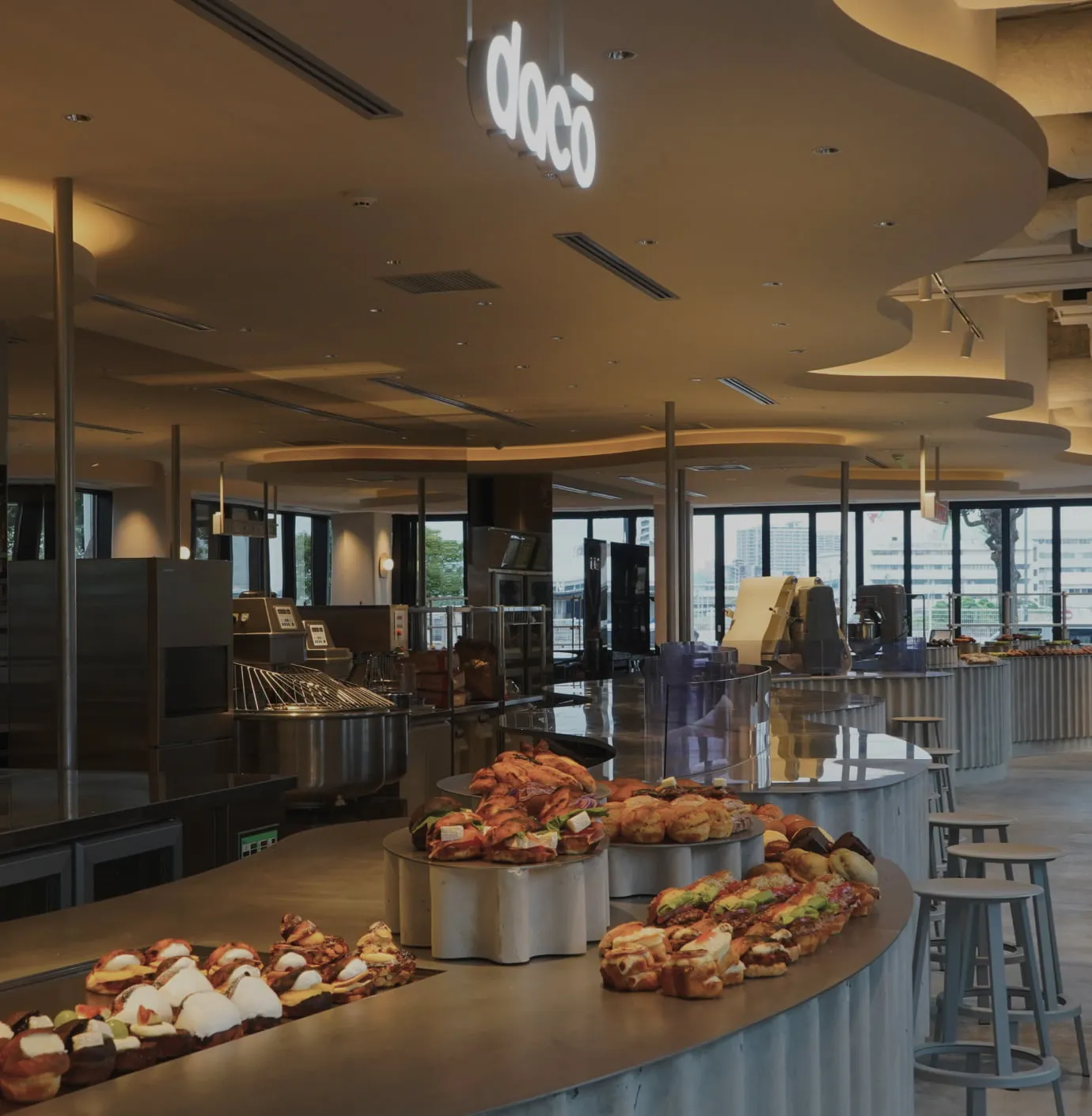 ダコーの店舗では、パン作りの工程を間近に感じられるオープンキッチンを採用しています。