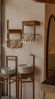 これまでのベーカリーにはない、新たな世界観。 入口の囲炉裏、 ライブ感溢れるメニューテーブル、カフェ。 五感全体でパンワールドが味わえる舞台的演出。 劇場型のキッチンから繰り広げられる、 炭火調理、鉄板調理などのパフォーマンスは、 さながらパンのテーマパークのよう。